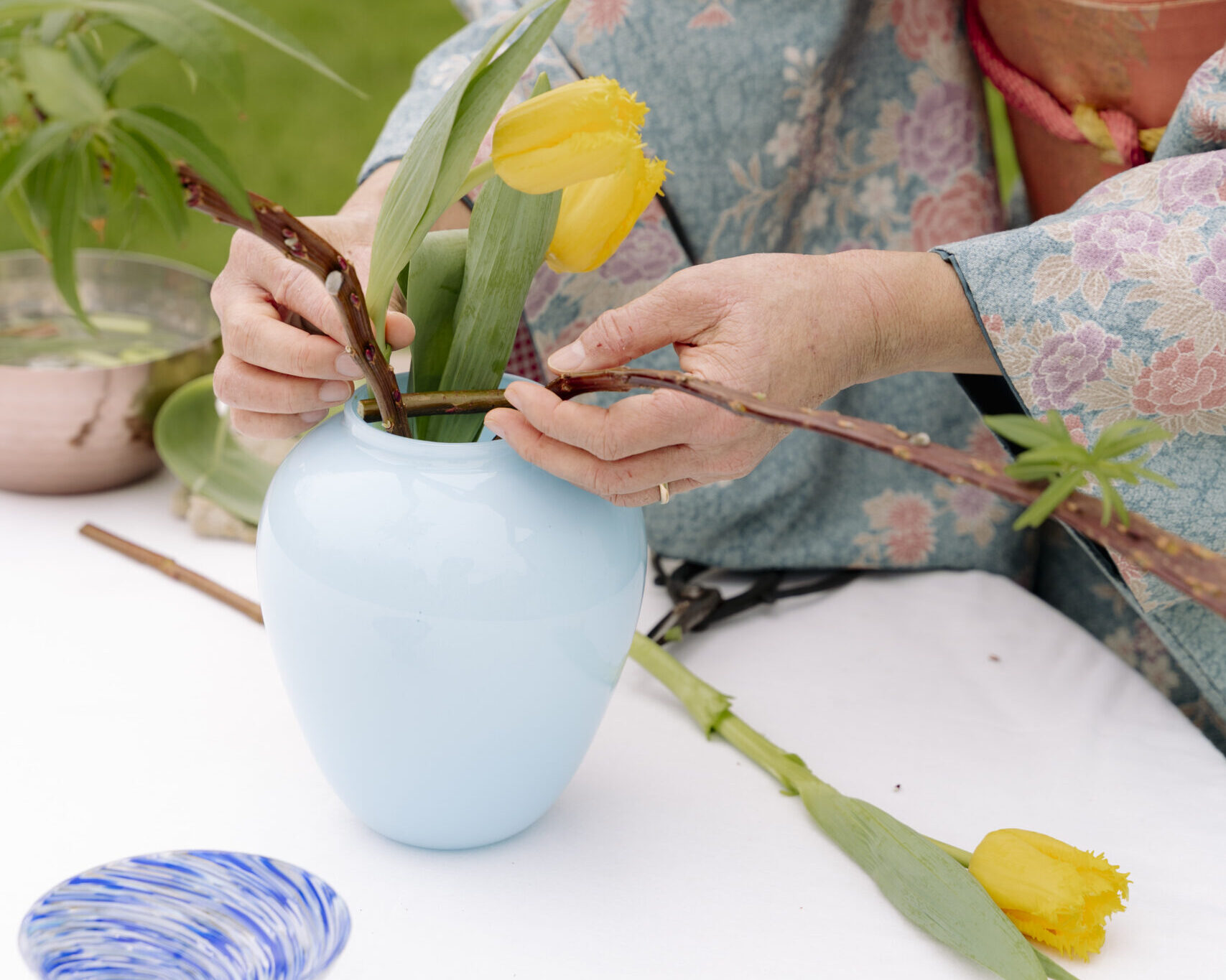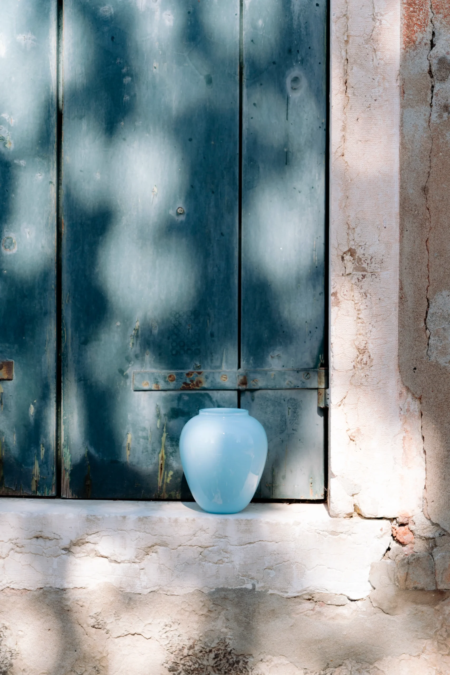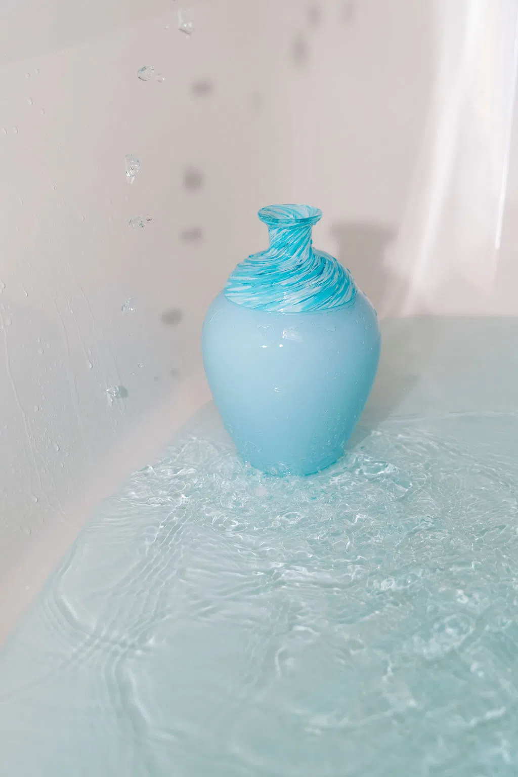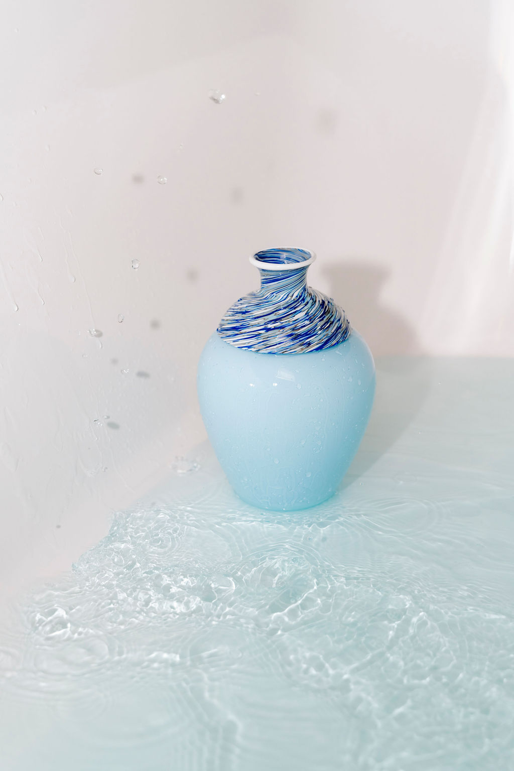 Le colorazioni blu e azzurro nascono invece da una miscela calibrata con precisione, dove ogni tonalità trova il suo equilibrio. Durante la lavorazione, la massa liquida di vetro viene ruotata, raccogliendo le polveri di colore e creando questo effetto unico.